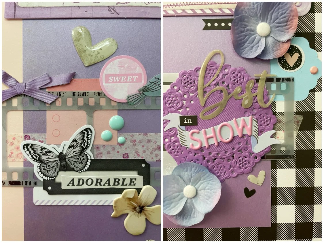I started with some plaid paper by Echo Park Paper Company. This paper is from their I Love Halloween collection but this particular paper didn’t have any specific Halloween designs on it so it worked for this page. I found an absolutely ancient piece of 8 1/2 X 11 purple pearl paper by The Paper Company (not sure if they still exist?) and used it in its entirety. Instead of using paper to my mat my photos, I used some frames by 49 and Market. I also added in a filmstrip by 49 and Market along with some washi tape by an unknown brand. From there, I embellished with stickers by Bo Bunny, Carpe Diem, The Happy Planner and chipboard die cuts by Stamperia. I happened to have some fake flowers that matched the color palette and affixed them to the page with fuzzy brads by Doodlebug. Lastly, I added some epoxy hearts and lavender laser cut elements, both by 49 and Market and some light blue enamel dots by Altenew.