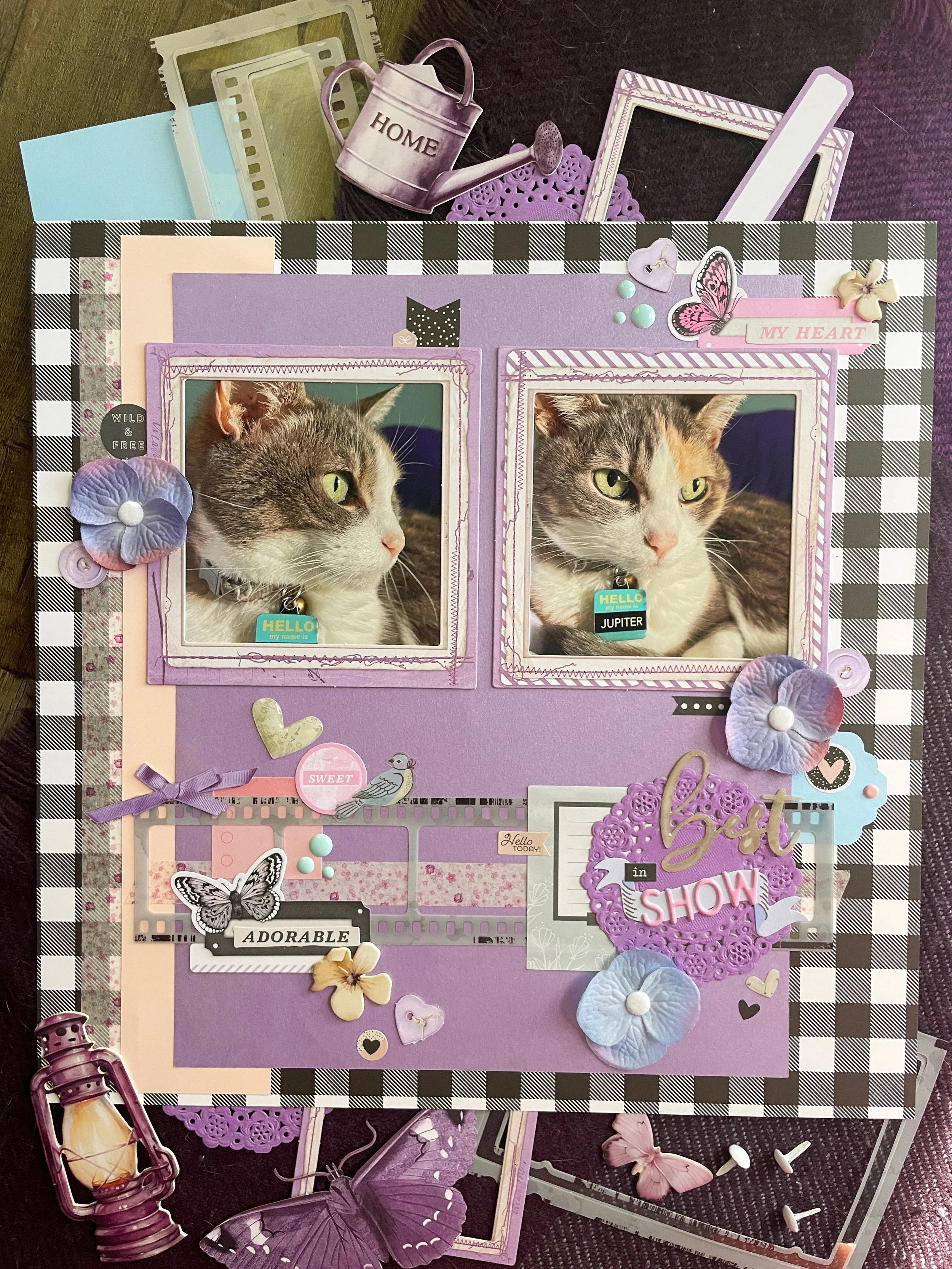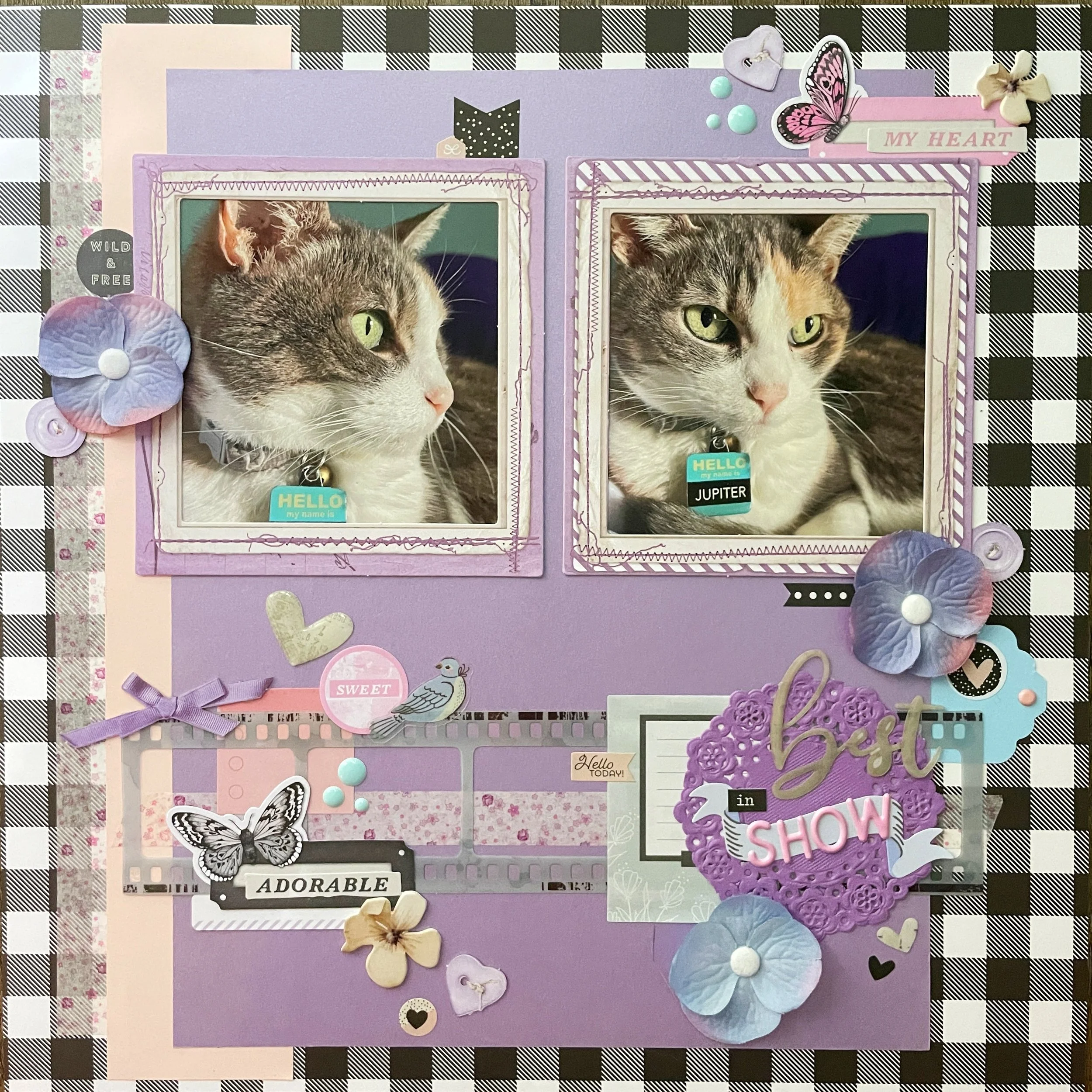 Hi scrappers! I’m back again with Color Dare with a brand new page. I have seemingly endless photos of my two cats and I used some of my kitty Jupiter to make this page.