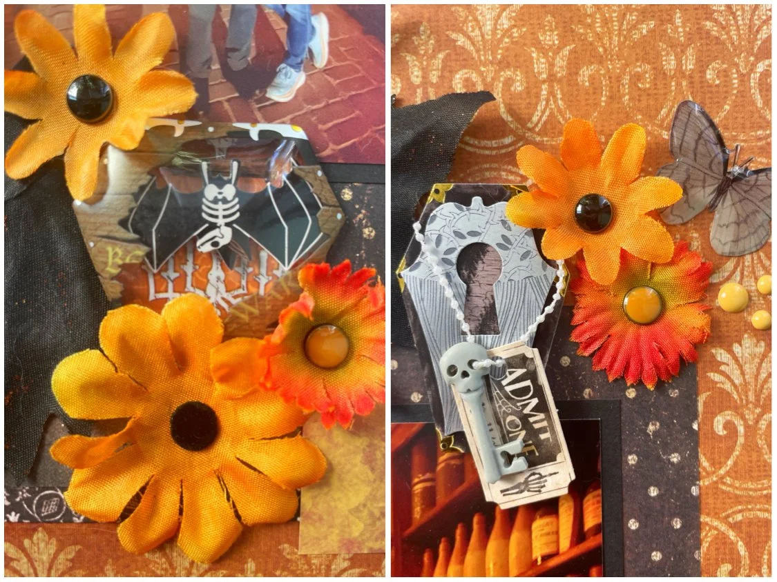 My main embellishments were a bunch of fake flowers, held in place by some brads by My Mind’s Eye and Doodlebug. I added in some Vintage Coffin stickers by Jolee’s Boutique and butterflies by 49 and Market. A few enamel dots by Waffle Flower and Altenew finish the look.