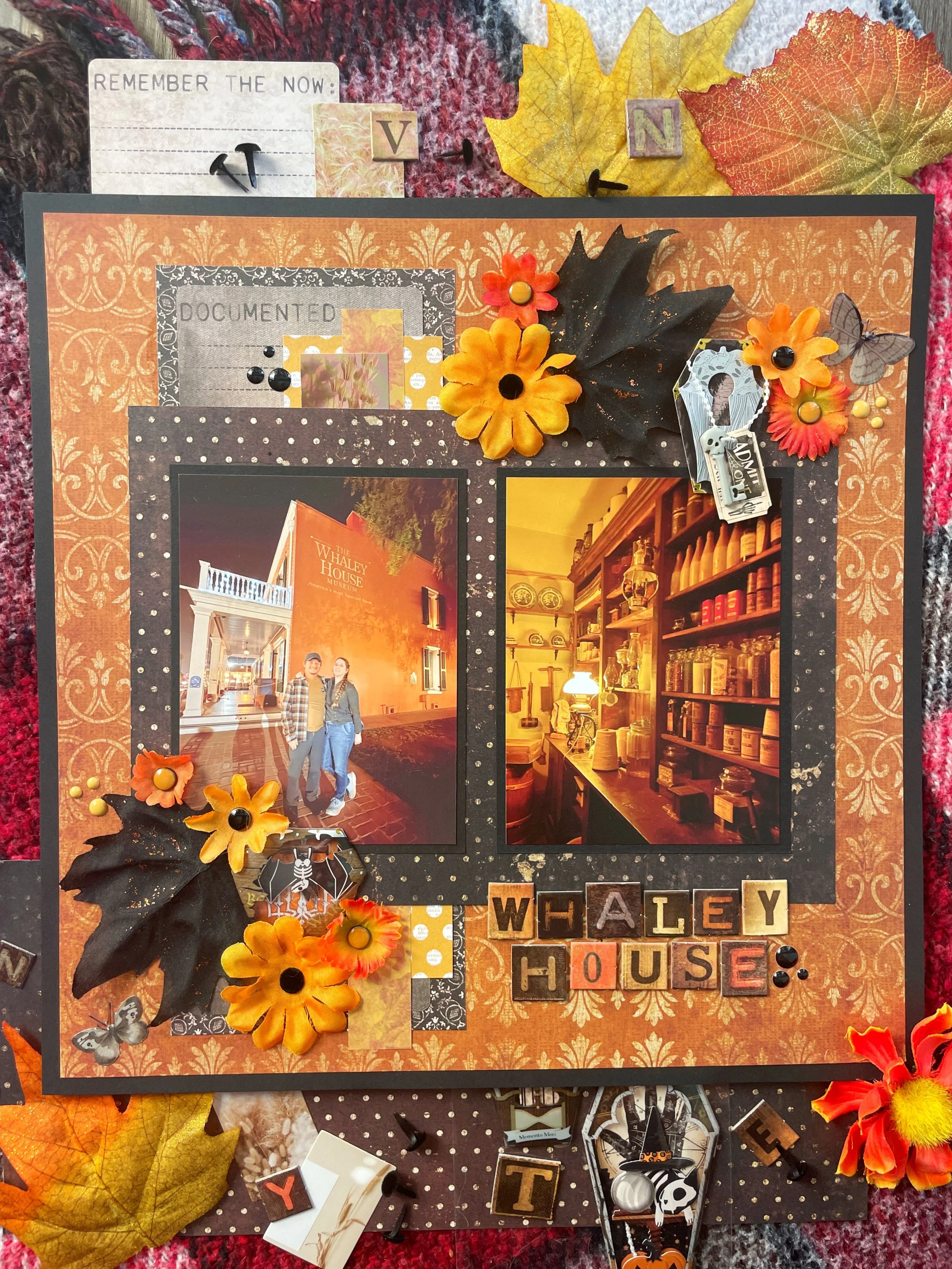 Hi scrappers! Now that we’re into October, the spooky-themed challenges are here! There are several challenges across scrapbooking blogs featuring black and orange and I created a page with this color palette. To match the vibe, I used some photo’s taken at San Diego’s Whaley House.