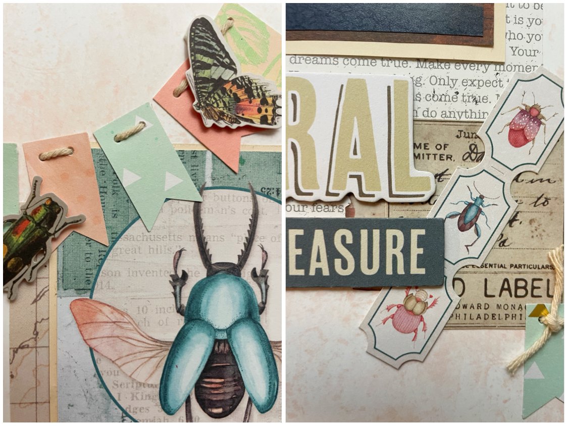 I used some light, peachy cardstock by 49 and Market as my background. This paper is nice and thick and makes a great base especially when layering lots of things on top of it. I then took a piece of paper from the P13 Naturalist stack and cut out squares featuring a beetle and a butterfly. I used the reverse side of the paper that has a sepia-toned world map on it and combined it with some Type Writer Print paper by Recollections to place behind my photos. I used a punch by Fiskars to make some pennants and sewed them down with some thick cord.