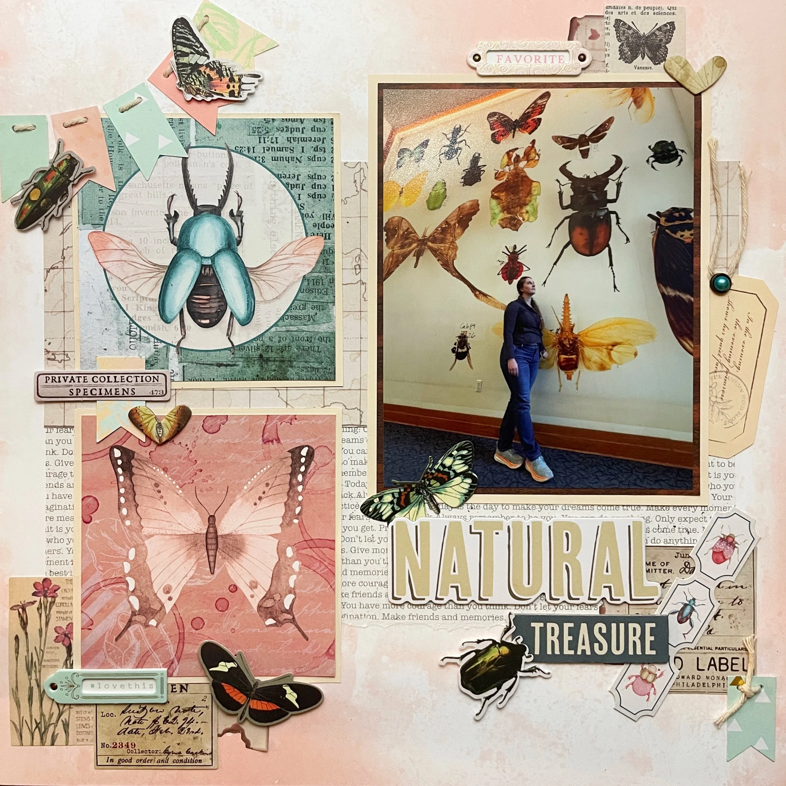 Hi scrappers! This week I am scrapping a photo that was taken at the San Diego Natural History Museum. One of the walls near the insect exhibit features a giant mural depicting oversized bugs and butterflies. My husband snapped this photo of me standing in front of it.