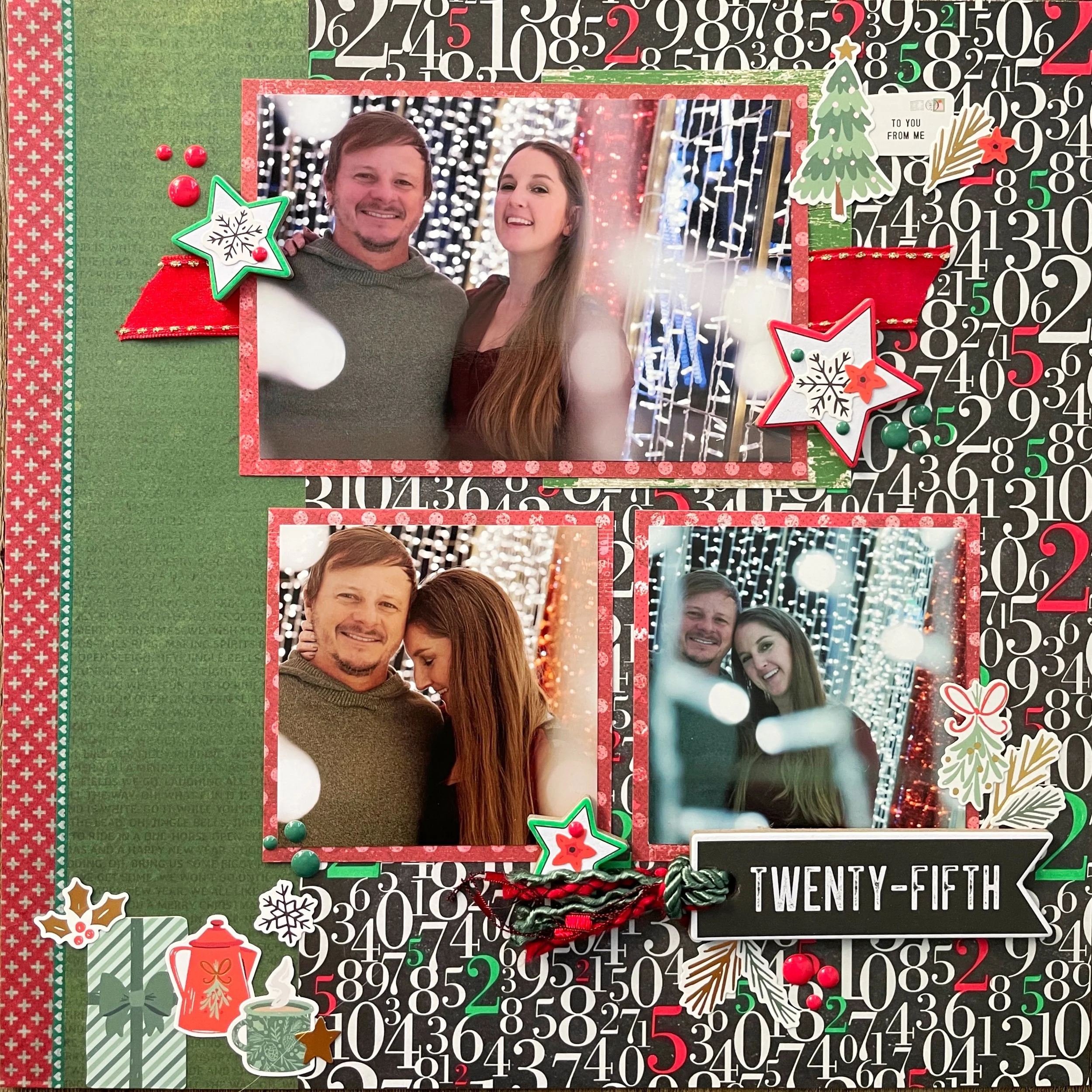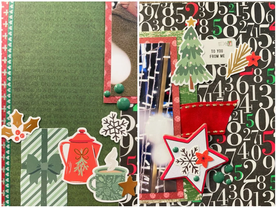 I started with some green patterned paper by American Crafts from the Evergreen & Holly collection as my background. I created a border on the left with some red and green washi and then used a large scrap of paper left over from my last page. I used the other side of the Fun Times paper I used by 49 and Market and colored in random 2s and 5s with red and green markers. I used another sheet from the Evergreen & Holly paper stack to make polka dot photo mats. The title and stars are from an Evergreen & Holly chipboard set. I colored the edged red and green with the same markers and then decorated them with some Mittens & Mistletoe stickers and enamel dots by Altenew and Eyelet Outlet.
