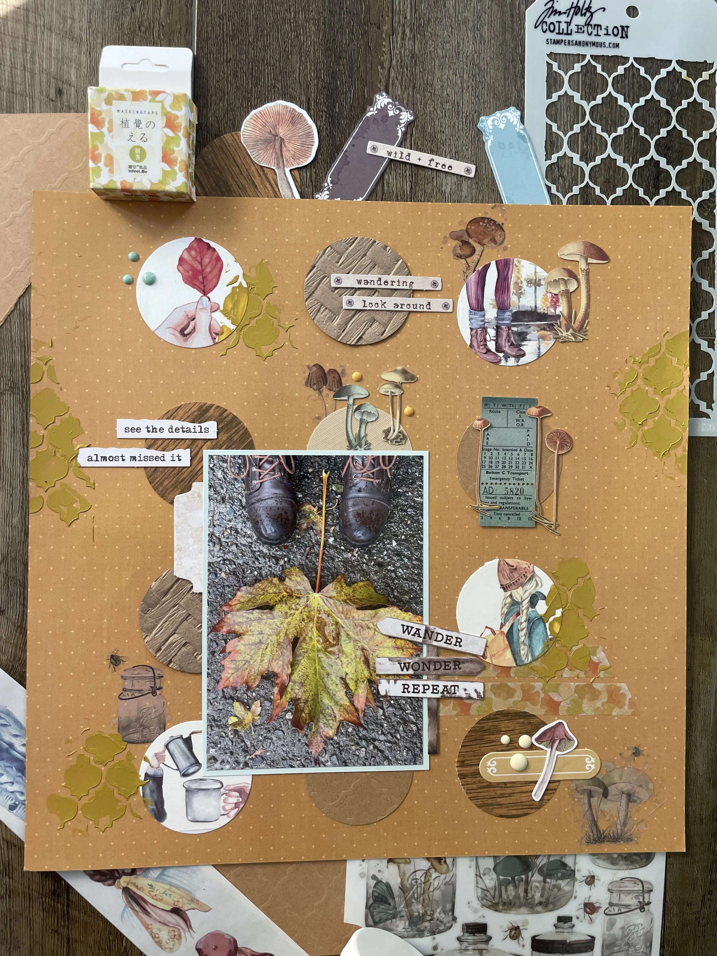 I started with the mustard polka dot side of Maggie Holmes’ Cher Maison paper and used it as my background. I then used a circular squeeze punch to cut out lots of circles from some paper scraps from my stash. I used some washi tapes my London Gifties over the top of the while circles to create some fall-themed embellishments. I used a Tim Holtz embossing folder on 2 of the circles to add a woven texture to them. From there, I used rub-ons, laser cuts and ephemera from 49 and Market’s Nature Study collection to add even more embellishments, one which I used as a title. Lastly I added in some mixed media elements with a Time Holtz stencil and Yellow Ochre stencil butter by The Crafters workshop and scattered a few enamel dots by Carta Bella.