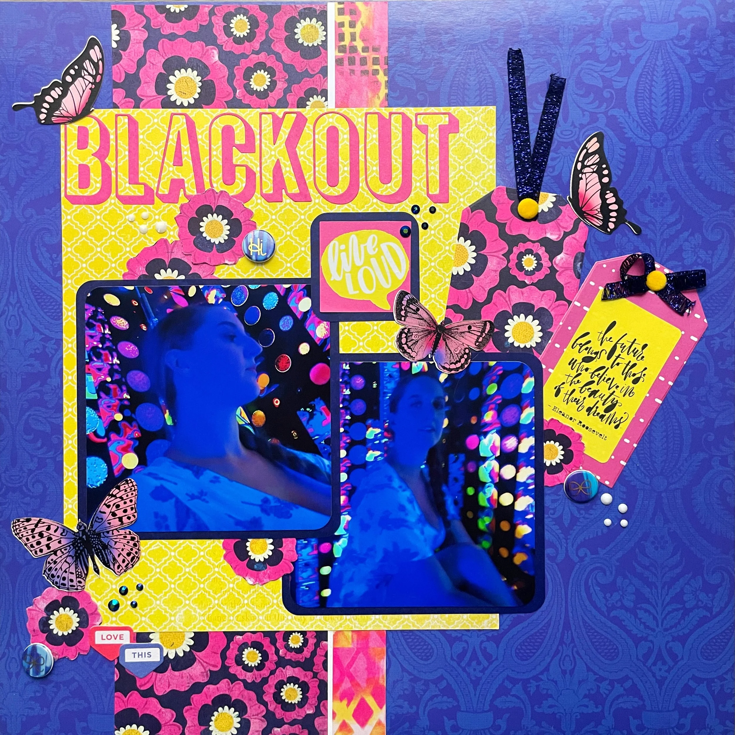 Hi scrappers! I’m back with Color Dare for an all new challenge. The photos I used were taken many years ago at a pop-up interactive art exhibition in Los Angeles called Flutter Experience. This room in the exhibit was lit solely by blacklight so the designs on the wall glowed bright. I took these unique selfies and matched my page background to the blue color in the photos.