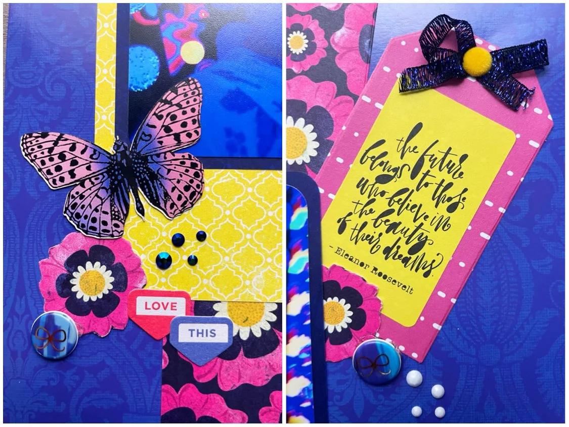 The title was made using the negative image from Tim Holtz’s Alphanumeric Shadow Upper dies and the quote on my tag is a sticker from The Happy Planner’s Quote sticker book. Since the colors and patterns used were already so bold, I only embellished with a few items, including some flowers I fussy cut from the patterned paper, some adhesive gemstones by Honey Bee Stamps, and some butterflies by Aall and Create.