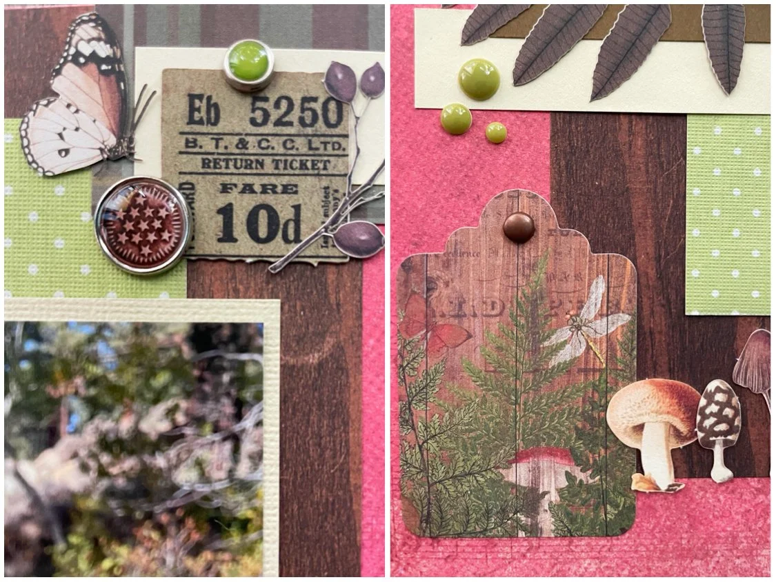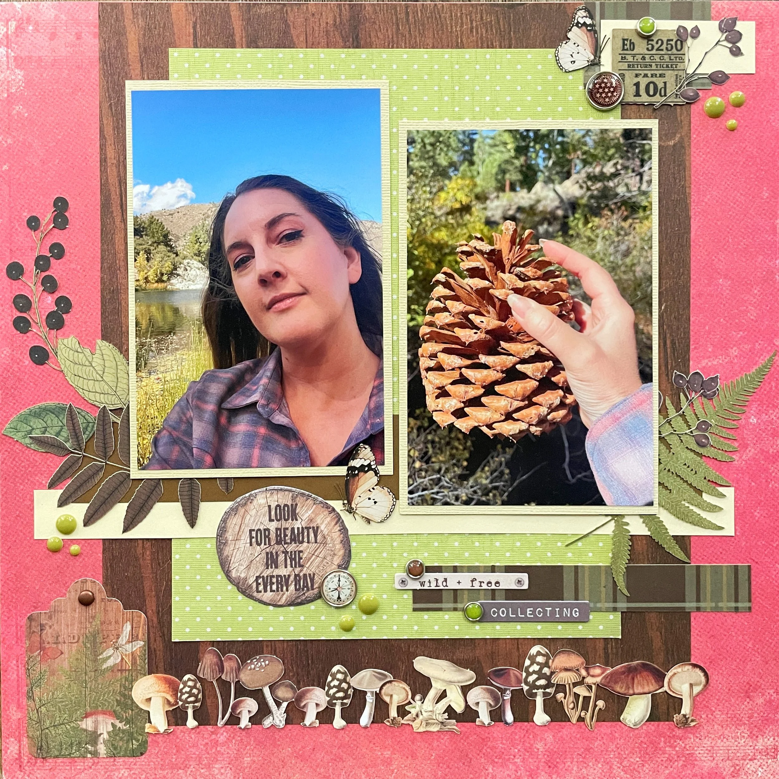 I used a sheet of pinkish red paper from Vicki Boutin’s Evergreen & Holly stack, once again using Christmas paper for a non-Christmas project! I then cut down a piece of Momenta polka dot cardstock and paired it with some woodgrain paper by The Paper Studio. I used a sheet of neutral cardstock by American Crafts to mat my photos and then found some additional paper scraps in my stash to create some clusters and accents. I then used some laser cutouts by 49 and Market and Arden (which worked amazingly well together. You can’t even tell they are from different manufacturers) and layered them behind my photo and created a border along the bottom of little mushrooms. I added a tag by Simple Stories because it was the perfect color and matched the theme of the page. Some adhesive brads and enamel dots also by Simple Stories finish the page.