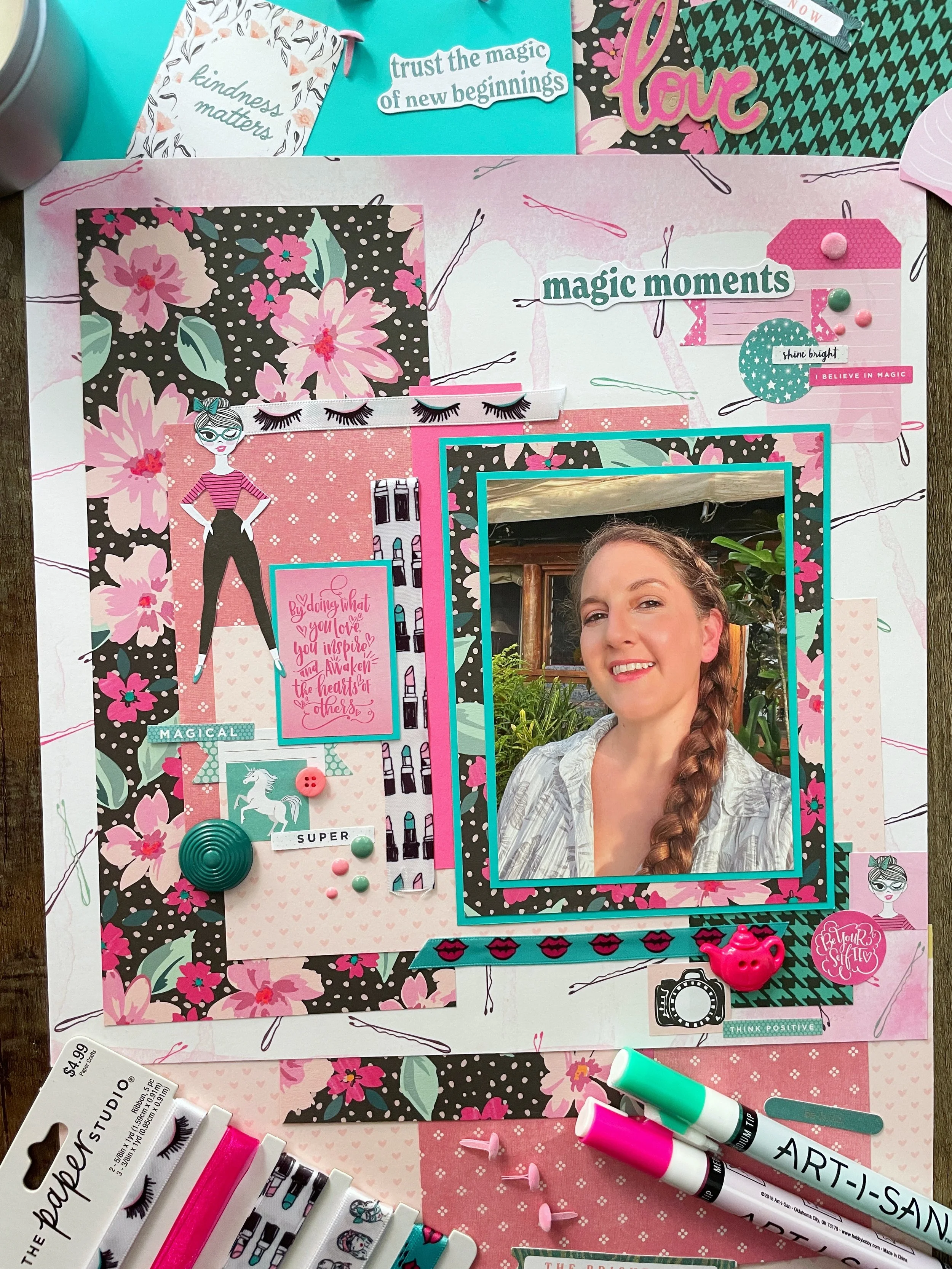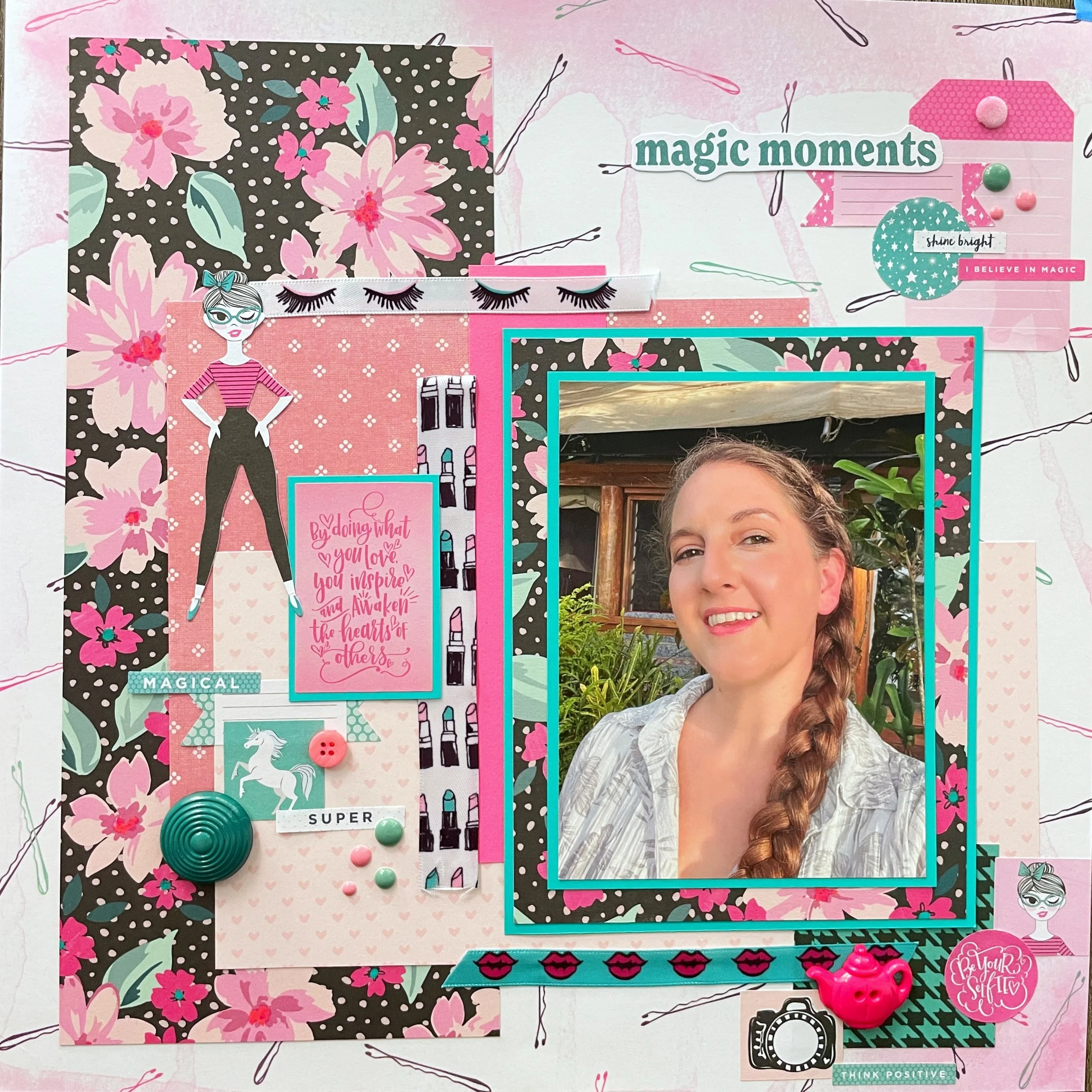 Hi scrappers! I’m back with Color Dare for a new challenge, this one using shades of pink. I used a selfie I took during a trip to Fiji for this page since the lip color I was wearing was also bright pink.