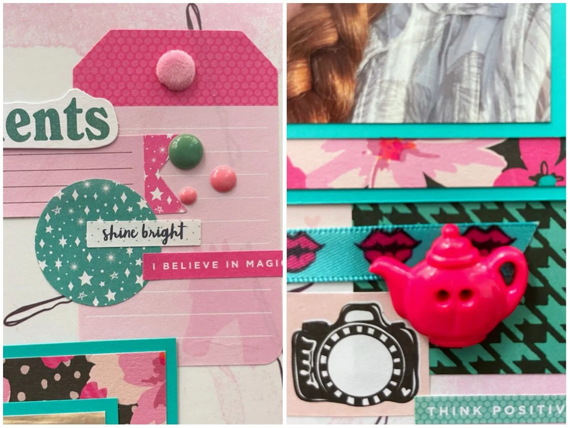 I used some cute bobby pin paper by We R Memory Keepers which set the tone for a girly toiletries page. I used some pieces of ribbon from The Paper Studio that featured lipstick, lips and eyes with colorful eyeliner. I also used a sticker book and ephemera from Shimelle’s Glitter Girl collection and used an ephemera piece from Prima’s Majestic pack as my title. I added in some stickers from The Happy Planner’s Quotes sticker book as well as some assorted buttons from my stash and enamel dots by Simple Stories and Altenew.